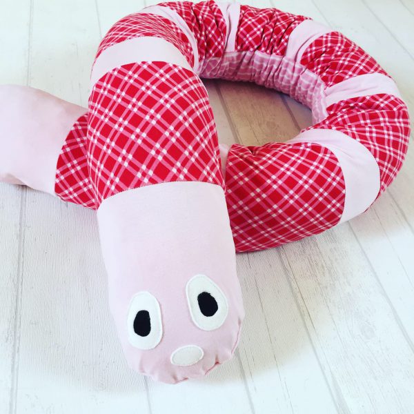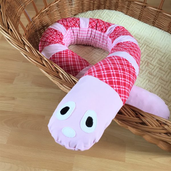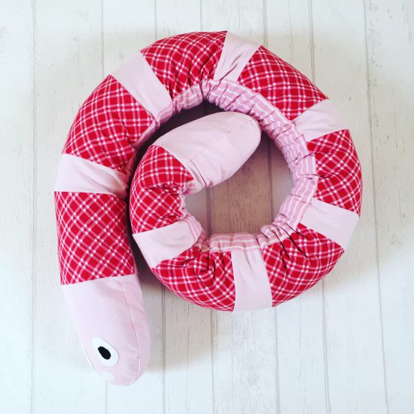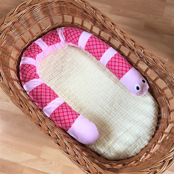 Dieser Bezug ist komplett aus Bio-Jersey genäht. Kopf und Schwanz sowie die schmalen Felder sind in zartem Rosa gehalten, die breiteren Felder in Karo rot. Der Bauch ist rosa-weiß gestreift und hebt sich so dezent vom Rücken ab.