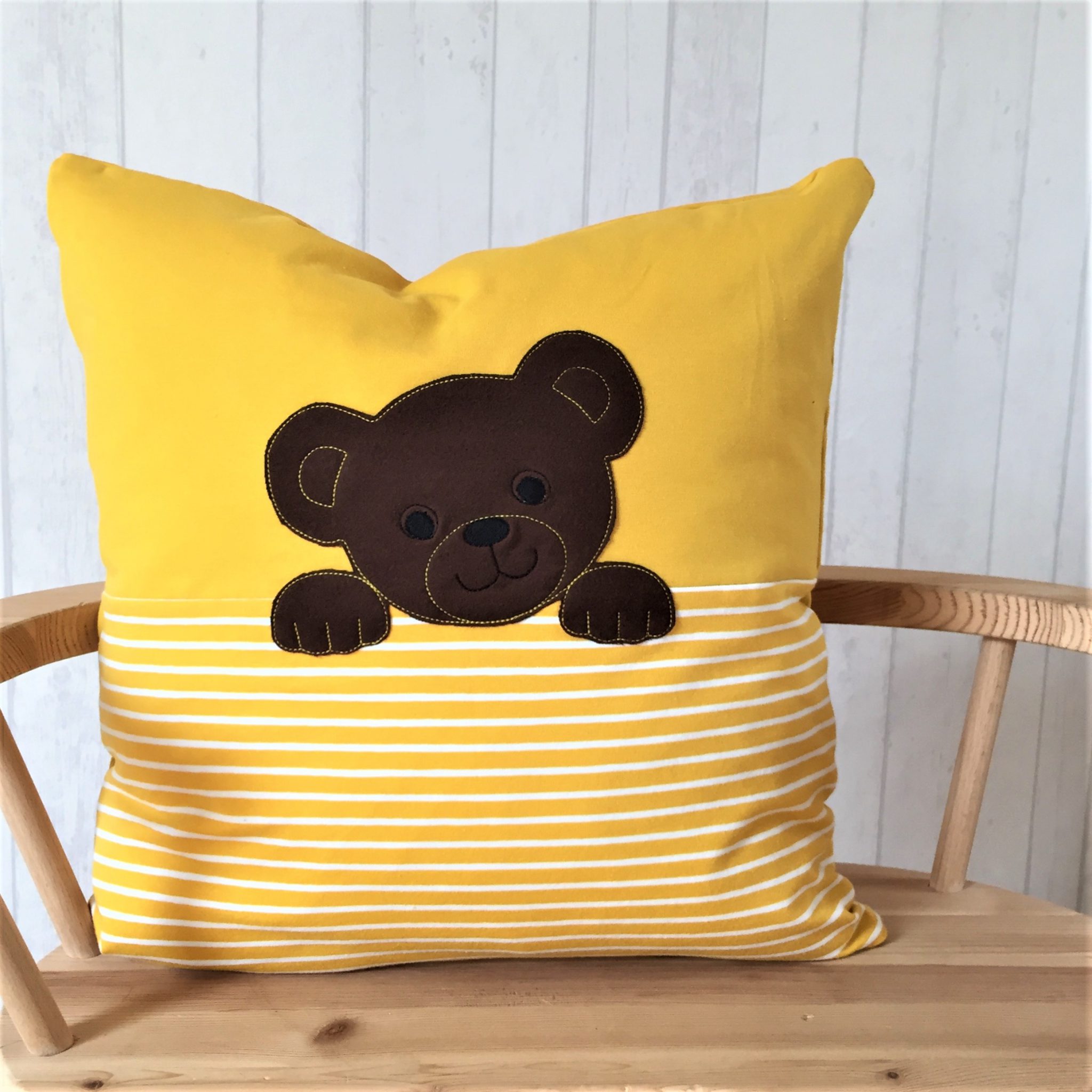 “Lena” ist ein kuscheliges Kissen aus Bio-Jersey, in der Mitte eine Teilungsnaht, unten gemustert und oben uni.