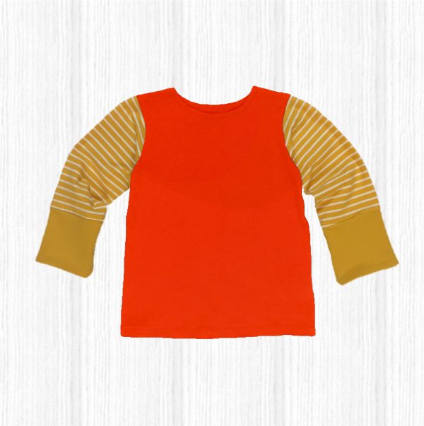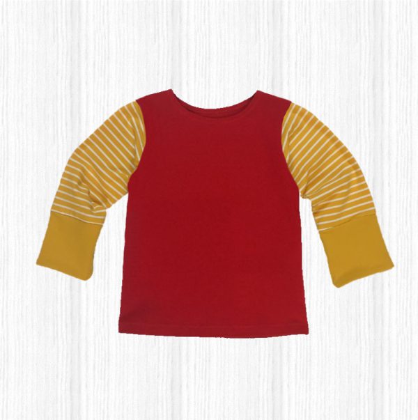 Die Kombination aus einem farbkräftigem Vor- und Rückteil und stets gelb-weiß-geringelten Ärmeln ist charakteristisch für den Pullover “Jetti”. Bei “Jetti” ist der Ärmelsaum (die letzten 8 bis 10 cm des Ärmels) außen unifarben und innen geringelt. „Jetti“ ist aus Bio-Baumwolljersey gefertigt und normal bis schmal geschnitten.